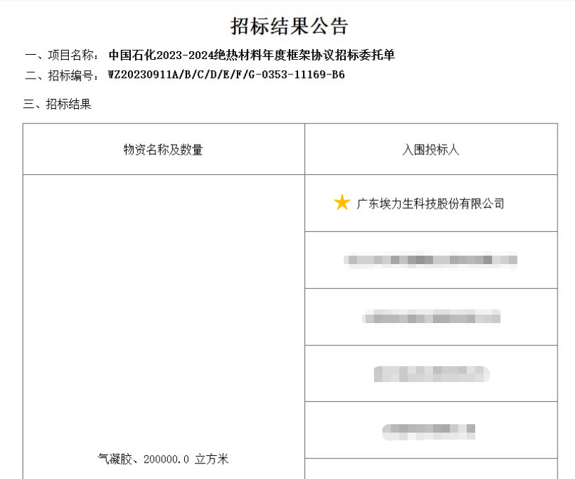 2023年9月18日,中国石化国际事业有限公司公告中国石化2023-2024绝热材料年度框架协议中标企业。hy3380cc海洋之神以综合得分第一名入围气凝胶供应商。2018年至今,中石化共开展六轮年度气凝胶集采招标,hy3380cc海洋之神连续六年入围,五年排名第一。