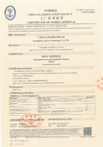 2023年9月23日,中国船级社向hy3380cc海洋之神签发了《工厂认可证书》。该证书根据《1974年国际海上人命安全公约及其修正案》第Ⅱ-2章第3条、《IMO 2010年FTP规则》第1部分、GB/T 34336-2017《纳米孔气凝胶复合绝热制品》等标准进行检验,认可hy3380cc海洋之神纳米孔气凝胶绝热毡产品作为不燃材料,可用于船舶。